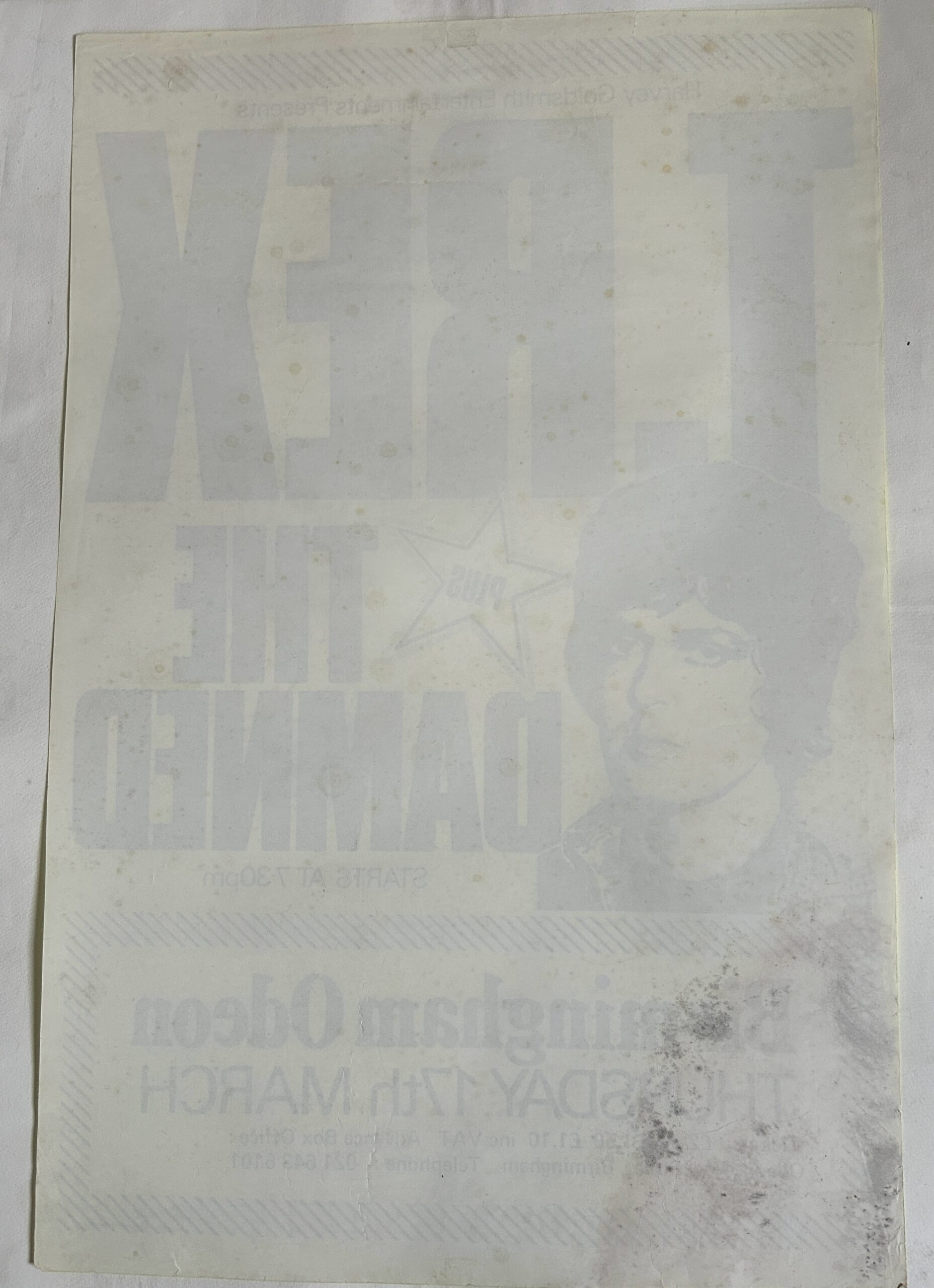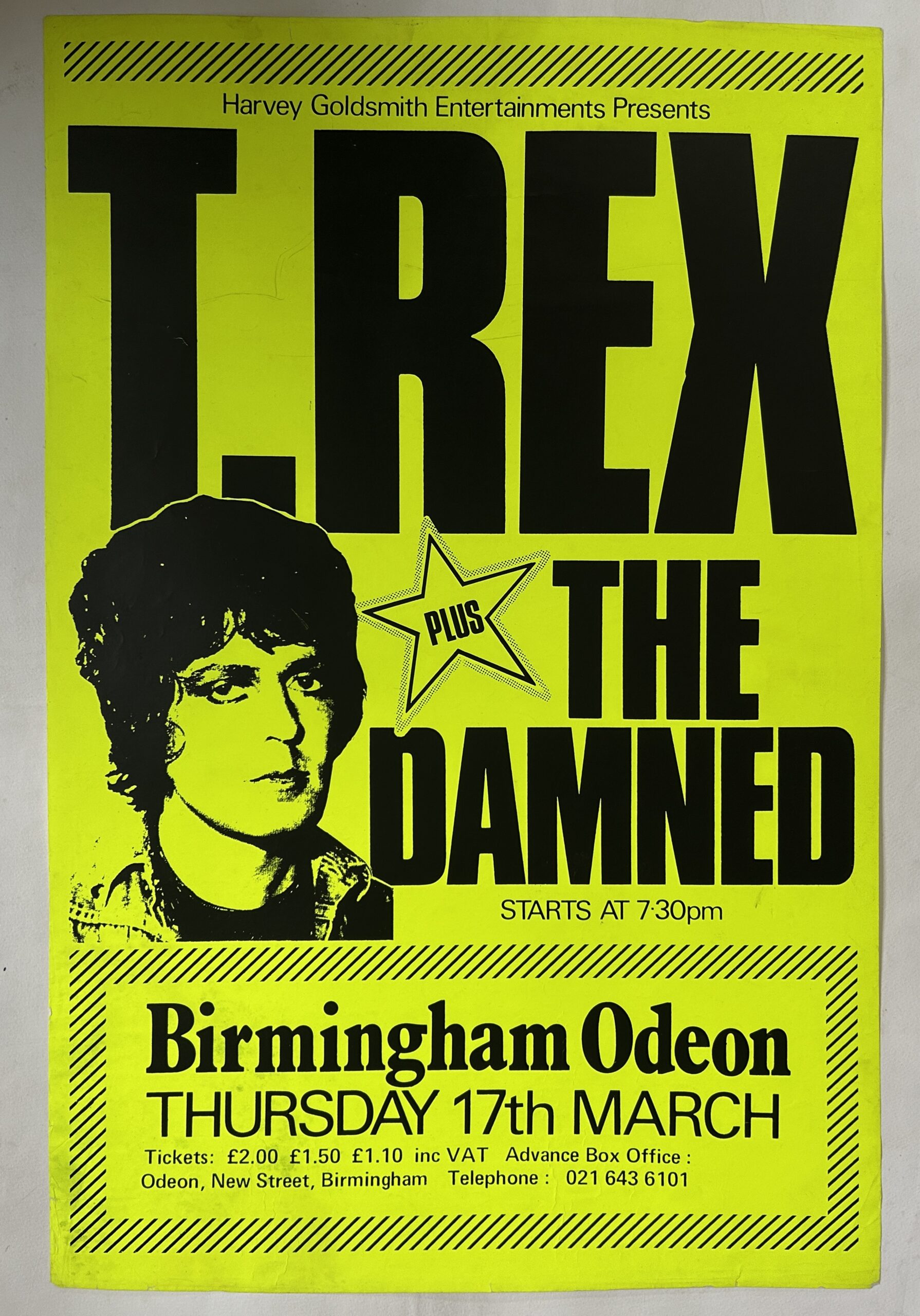 A scarce original [approx] 77cm x 50cm poster for Marc Bolan’s tour with the Damned – Birmingham Odeon 17th March 1977. Bolan’s last British concert was on this tour – 20th March at the Locarno in Portsmouth, – his final show 24th March 1977 was with T. Rex at Gröna Lund, Stockholm, Sweden